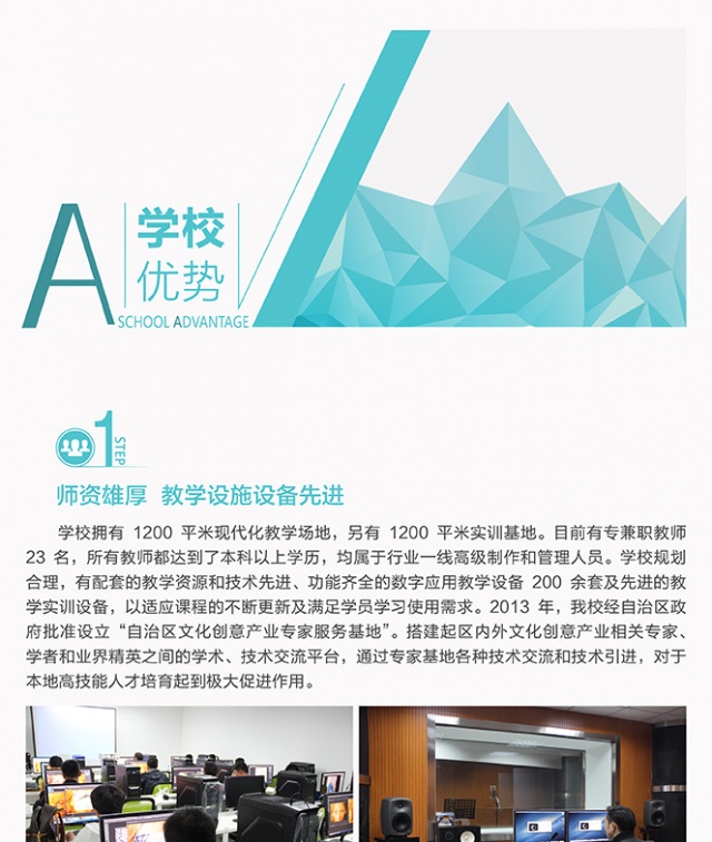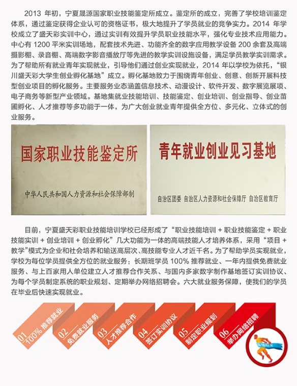 寧夏盛天彩職業(yè)技能培訓(xùn)學(xué)校是經(jīng)自治區(qū)人力資源與社會保障廳審核批準(zhǔn)的寧夏地區(qū)成立最早、教學(xué)規(guī)模最大設(shè)置課程最全面、專業(yè)性最強(qiáng)的數(shù)字藝術(shù)培訓(xùn)機(jī)構(gòu),是銀川市政府重點扶持的動畫教育實訓(xùn)基地,寧夏文化創(chuàng)意產(chǎn)業(yè)基地指定人才培養(yǎng)中心,也是西北地區(qū)唯一接受中央電視臺專訪的高技能人才培育機(jī)構(gòu)。